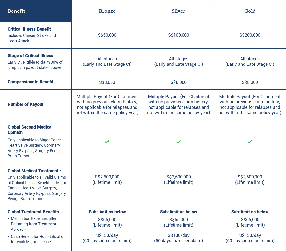 *Global Medical Treatment Lifetime Limit paid to a maximum of 2,000,000 USD, amount in table is equivalent in SGD on current exchange rates.